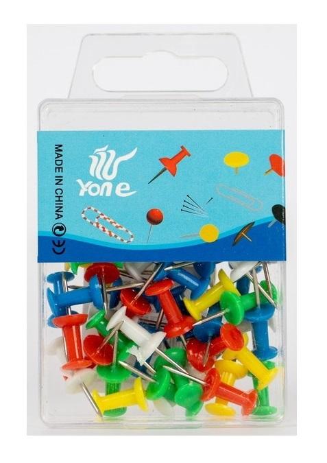 50 szt., w pudełku 5 różnych kolorów, średnica 7 mm, końcówka 10 mm, odpowiednie do tablic korkowych