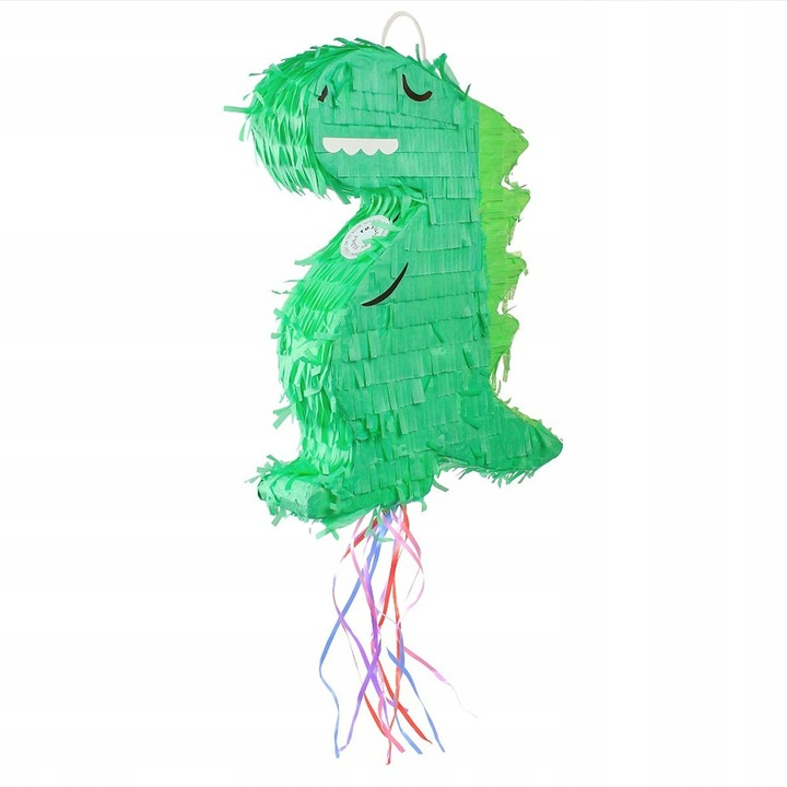 Piniata DINOZAUR rozm. 43x34x8.5 cm Twoje dziecko uwielbia dinozaury i chcesz sprawić mu przyjemność podczas urodzin? Organizujesz imprezę archeologiczną i chcesz aby były na niej obecne dinozaury? Chcesz zapewnić dodatkową atrakcję na zabawie w ogrodzie? Piniata dinozaur to super atrakcja dla małych i dużych :) Jest to piniata typu PULL, co oznacza, że nie musimy jej rozbijać, a wystarczy pociągnąć za wstążki znajdujące się u dołu piniaty. Ilość: 1 sztuka Wymiary: 43 x 34 x 8,5 cm