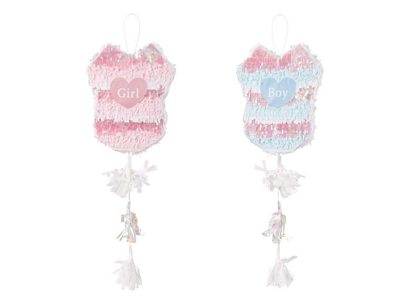 Piniata składana w kształcie body dziecięcego z napisem Boy or Girl, mix kolorów, do wypełnienia upominkami, słodyczami lub płatkami kwiatów. Wymiary po złożeniu ok. 30 x 35 x 8 cm.