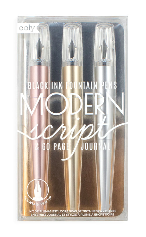 Zestaw 4 elementów PIÓRA WIECZNE I NOTES MODERN SCRIPT - 3 pióra wieczne w obudowach: złoto, różowe złoto, srebna - 60 stronnicowy notes w linie (9.5 x 15 cm) ze srebrno-złotą okładką ombré - Pasują do nich wszystkie naboje OOLY - Pasują do ołówków Modern Graphite Pencils