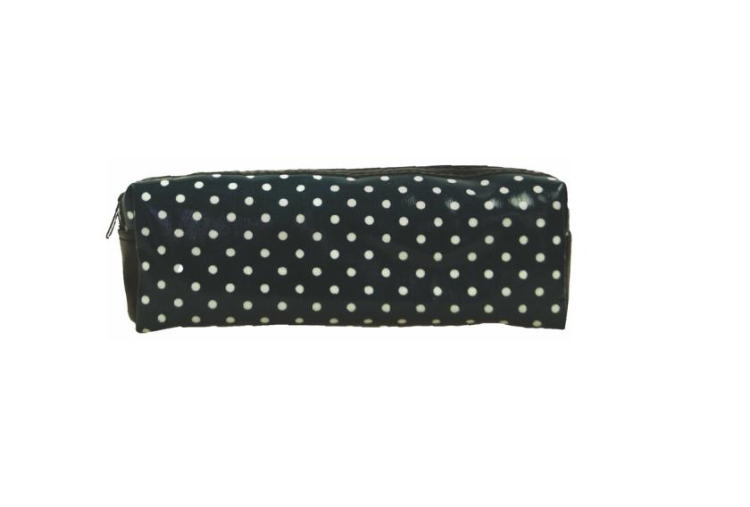 Pojemny piórnik saszetka zapinany na zamek. Wykonany z błyszczącego poliestru. Modny wzór w kropki.
