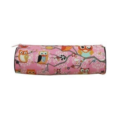 Piórnik jednokomorowy w różowym kolorze, zdobiony grafiką w kolorowe sowy siedzące na gałęziach.