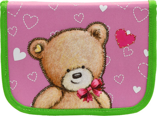 Wykonany z najwyższą dokładnością i starannością piórnik jednosuwakowy dwuklapkowy na licencji Popcorn The Bear. Wewnątrz obszyty mocnym materiałem z kolorowym zadrukiem w serduszka, łatwym w czyszczeniu. Dokładnie wykończone suwaki sprawiają, że przestajemy się bać o utratę suwaka już w pierwszych godzinach użytkowania. Dzięki tak solidnemu wykonaniu jest doskonałą propozycją dla dzieci zaczynających swą przygodę w szkole lub w przedszkolu. Uroczy design z naszywką pluszowego Misia z zewnątrz pozwala cieszyć oko za każdym razem gdy się na niego spojrzy. Dostępny w dwóch różnych wersjach: jasny oraz ciemny róż. Wyposażenie: - 12 kredek KOH-I-NOOR - 6 flamastrów KOH-I-NOOR - ołówek KOH-I-NOOR - długopis - gumka do ścierania MILAN - temperówka Wymiary: 20,5 x 4 x 12 cm