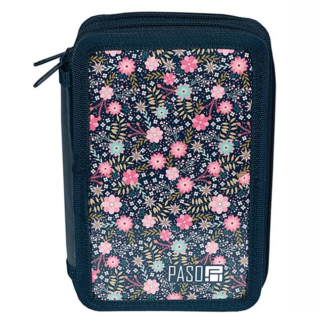 Piórnik dwukomorowy bez wyposażenia w kwiatki. Zamykany jest na wygodne dwa zamki. Wewnątrz piórnika znajdują się uchwyty na przybory piśmiennicze. W Paso dbamy, aby nasze piórniki były funkcjonalne, lekkie i jednocześnie pakowne.