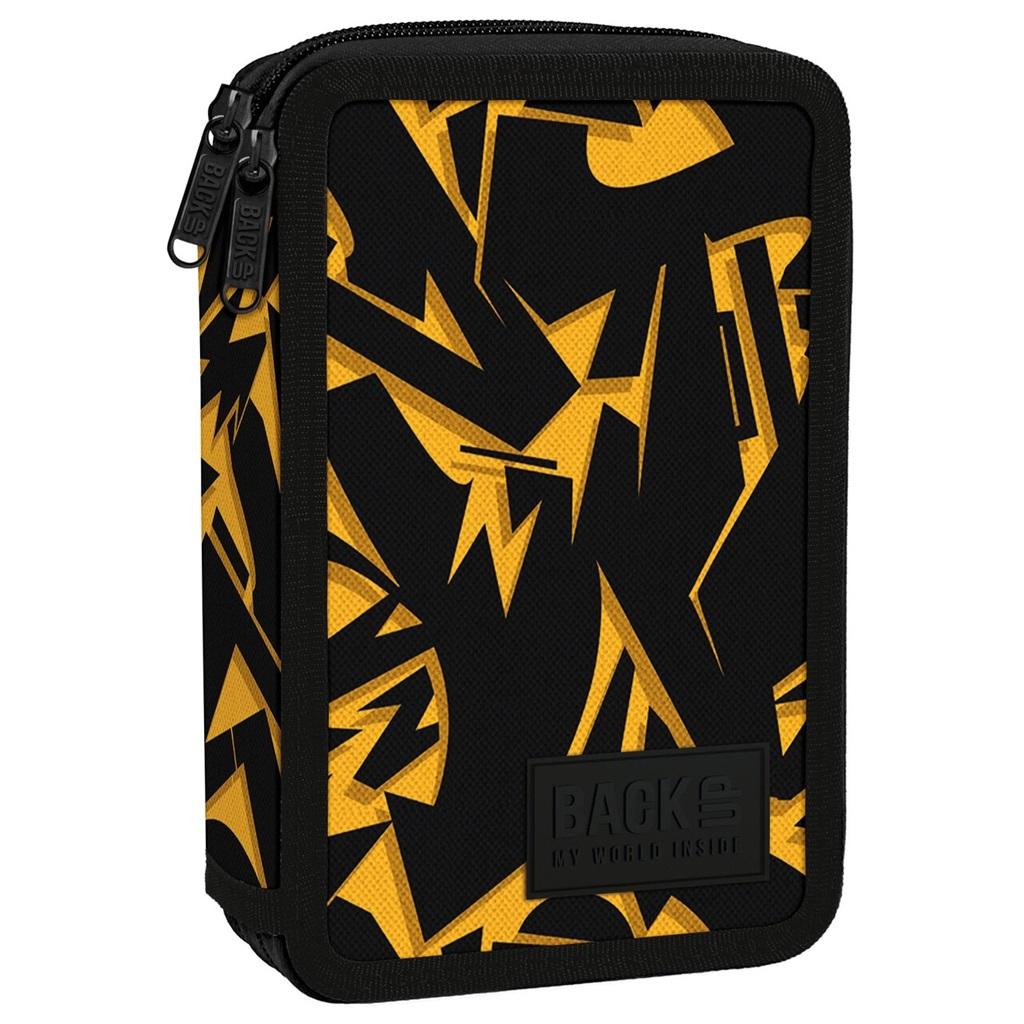 Gotowi na sporą dawkę emocji? Odlotowe kształty o ostrych krawędziach i intensywnej czarnej barwie przywodzą na myśl dynamiczne zwroty akcji. Głębokie, żółte tło materiału dodaje im jeszcze więcej ekspresji a czarne suwaki i zamki dopełniają całość. Dwukomorowy piórnik BackUP z wyposażeniem posiada: - 18 pisaków