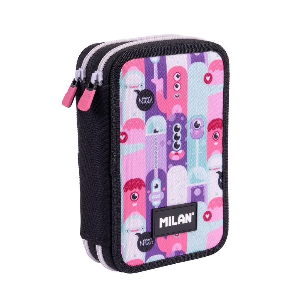 Piórnik 2-poziomowy z wyposażeniem, idealny do przechowywania przyborów szkolnych w uporządkowany i łatwo dostępny sposób. Kolekcja Aliens 2 z wesołym, różowo-liliowym wzorem przedstawiającym ułożonych w stos kosmitów, te same postacie, co drewniana zabawka Aliens Tower. Wewnątrz czarna podszewka. Zawartość zestawu: 2 gumki (4024 i Nata niebieska 7024B), 1 temperówka AFILA, 1 sześciokątny ołówek grafitowy HB, 1 długopis z niebieskim tuszem P1, 1 trójkątna linijka 15 cm, 12 trójkątnych kolorowych kredek i 18 flamastrów ze stożkową końcówką. Materiał zewnętrzny i wewnętrzny 100% poliester. Rozmiar piórnika: 19,5 x 13 x 5 cm. W piórnikach znajdziesz kredki MILAN przy produkcji których użyto drewna pochodzącego wyłącznie z plantacji, gwarantujących nieużywanie drewna z lasów deszczowych. Rysik kredki na całej długości jest przyklejony do drewna co zapobiega jego łamaniu. Dzięki trójkątnej budowie kredka jest ergonomiczna i wygodnie trzyma się dziecku. Flamastry MILAN posiadają wytrzymałą i elastyczną stożkową końcówką, która nie wpada do środka nawet przy silnym nacisku. Po chwilowym odkształceniu końcówka zawsze wraca do pierwotnego kształtu. Tusz na bazie wody. Flamastry nie zawierają ftalanów, metali ciężkich i innych. Temperówkę z bezpiecznym przykręconym ostrzem dzięki czemu ostrze nie oddzieli się od obudowy temperówki. Gumkę z naturalnym kauczukiem.