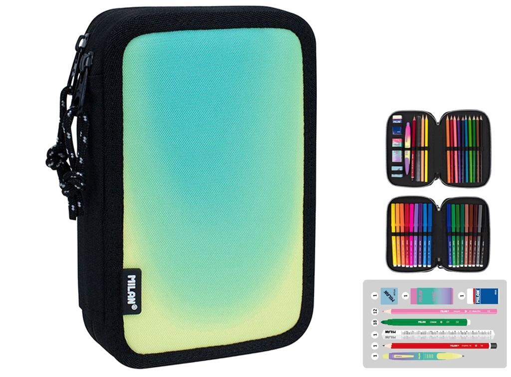 Piónik 2 - poziomowy z wyposażeniem z kolekcji SUNSET w kolorze czarno - zielonym. Połączenie gradientowych kolorów inspirowanych zachodem słońca z czarno-białymi detalami. Wyposażenie: 12 kredek trójkątnych, 18 flamastrów ze stożkową końcówką, długopis COMPACT SUNSET niebieski, ołówek sześciokątny HB, linijka trójkątna 15 cm, temperówka kwadratowa AFILA, 2 gumki 4024 i 320SN. Każdy poziom osobno zapinany na suwak. Przy produkcji piórników użyto najlepszych materiałów, bardzo wytrzymałych suwaków oraz wzmocnionych nici. Niepowtarzalne wzornictwo. Tkanina zewnętrzna Ripstop: lekka i odporna na rozdarcia. Wykorzystuje specjalną technikę, która tka grube, wzmacniane nici w regularnych odstępach, tworząc wzór krzyżowy. Materiał zewnętrzny i wewnętrzny 100% poliester. Rozmiar piórnika: 19,5 x 13 x 5 cm. W piórnikach znajdziesz min.: kredki MILAN przy produkcji których użyto drewna pochodzącego wyłącznie z plantacji, gwarantujących nie używanie drewna z lasów deszczowych. Rysik kredki na całej długości jest przyklejony do drewna co zapobiega jego łamaniu. Dzięki trójkątnej budowie kredka jest ergonomiczna i wygodnie trzyma się dziecku. Flamastry MILAN posiadają wytrzymałą i elastyczną stożkową końcówką, która nie wpada do środka nawet przy silnym nacisku. Po chwilowym odkształceniu końcówka zawsze wraca do pierwotnego kształtu. Tusz na bazie wody. Flamastry nie zawierają ftalanów, metali ciężkich i innych. Temperówkę z bezpiecznym przykręconym ostrzem dzięki czemu ostrze nie oddzieli się od obudowy temperówki. Gumkę z naturalnym kauczukiem.