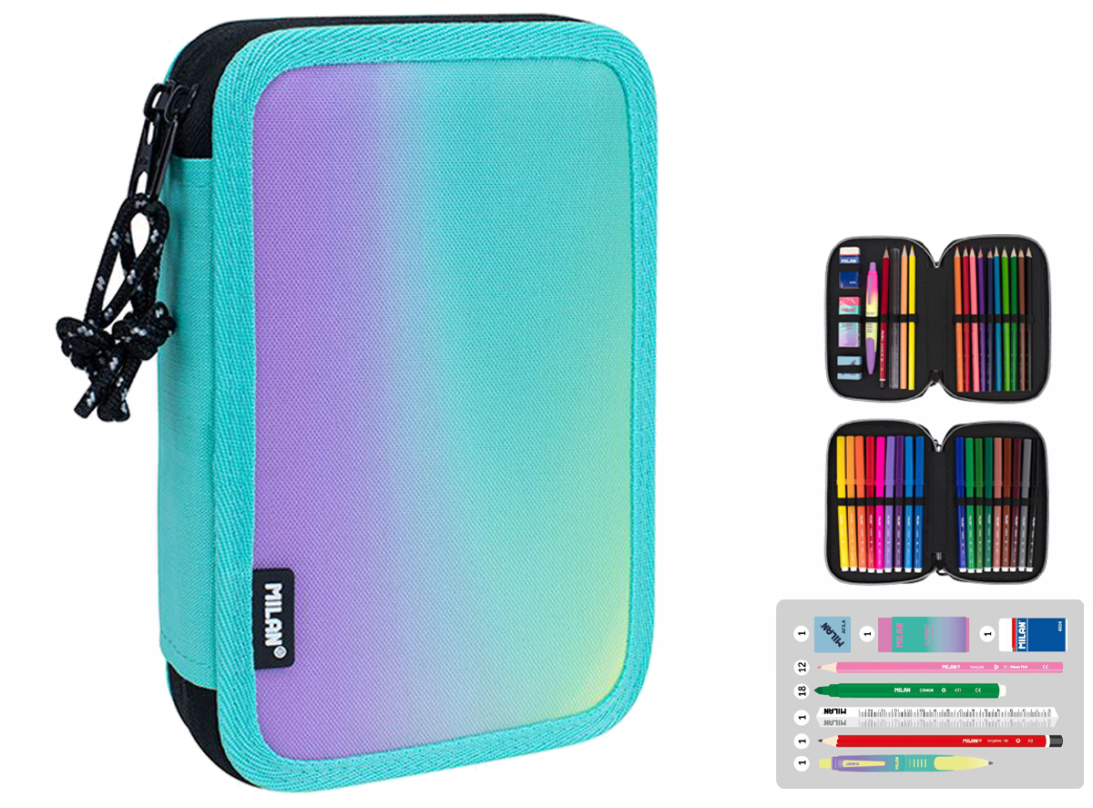 Piónik 2 - poziomowy z wyposażeniem z kolekcji SUNSET w kolorze zielonym. Połączenie gradientowych kolorów inspirowanych zachodem słońca z czarno-białymi detalami. Wyposażenie: 12 kredek trójkątnych, 18 flamastrów ze stożkową końcówką, długopis COMPACT SUNSET niebieski, ołówek sześciokątny HB, linijka trójkątna 15 cm, temperówka kwadratowa AFILA, 2 gumki 4024 i 320SN. Każdy poziom osobno zapinany na suwak. Przy produkcji piórników użyto najlepszych materiałów, bardzo wytrzymałych suwaków oraz wzmocnionych nici. Niepowtarzalne wzornictwo. Tkanina zewnętrzna Ripstop: lekka i odporna na rozdarcia. Wykorzystuje specjalną technikę, która tka grube, wzmacniane nici w regularnych odstępach, tworząc wzór krzyżowy. Materiał zewnętrzny i wewnętrzny 100% poliester. Rozmiar piórnika: 19,5 x 13 x 5 cm. W piórnikach znajdziesz min.: kredki MILAN przy produkcji których użyto drewna pochodzącego wyłącznie z plantacji, gwarantujących nie używanie drewna z lasów deszczowych. Rysik kredki na całej długości jest przyklejony do drewna co zapobiega jego łamaniu. Dzięki trójkątnej budowie kredka jest ergonomiczna i wygodnie trzyma się dziecku. Flamastry MILAN posiadają wytrzymałą i elastyczną stożkową końcówką, która nie wpada do środka nawet przy silnym nacisku. Po chwilowym odkształceniu końcówka zawsze wraca do pierwotnego kształtu. Tusz na bazie wody. Flamastry nie zawierają ftalanów, metali ciężkich i innych. Temperówkę z bezpiecznym przykręconym ostrzem dzięki czemu ostrze nie oddzieli się od obudowy temperówki. Gumkę z naturalnym kauczukiem.