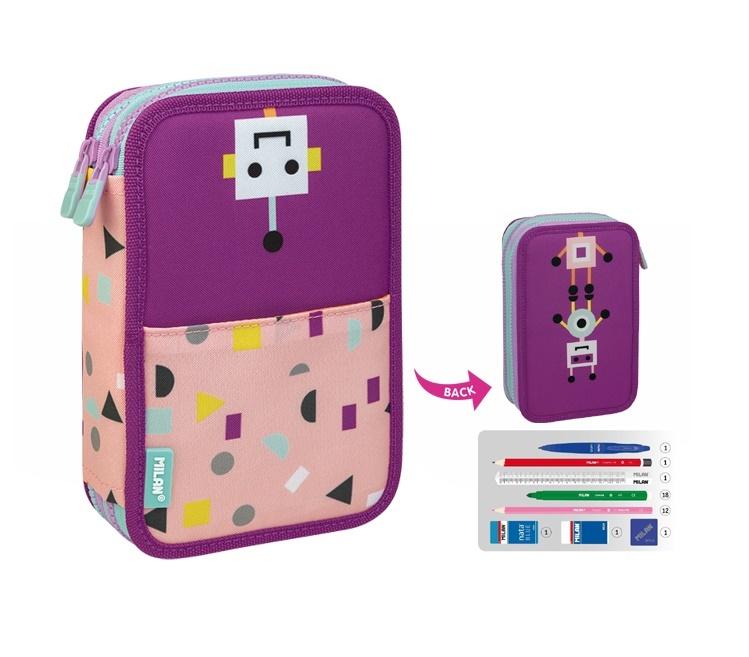 Piórnik MILAN 2-poziomowy z wyposażeniem z kolekcj HAPPY BOTS w kolorze różowo-filoetowym z kolorowym nadrukiem. Wyposażenie: długopis CAPSULA UNO niebieski, ołówek sześciokątny HB, linijka trójkątna 15 cm, 18 flamastrów, 12 kredek trójkątnych, temperówka, 2 gumki do ścierania. Przy produkcji piórników użyto najlepszych materiałów, bardzo wytrzymałych suwaków oraz wzmocnionych nici. Niepowtarzalne wzornictwo. W piórnikach MILAN znajdziesz min.: ? Kredki MILAN przy produkcji których użyto drewna pochodzącego wyłącznie z plantacji, gwarantujących nie używanie drewna z lasów deszczowych Rysik kredki na całej długości jest przyklejony do drewna co zapobiega jego łamaniu. Dzięki trójkątnej budowie kredka jest ergonomiczna i wygodnie trzyma się dziecku. ? Flamastry MILAN posiadają wytrzymałą i elastyczną stożkową końcówką, która nie wpada do środka nawet przy silnym nacisku. Po chwilowym odkształceniu końcówka zawsze wraca do pierwotnego kształtu. Tusz na bazie wody. Flamastry nie zawierają ftalanów, metali ciężkich i innych ? Temperówkę z bezpiecznym przykręconym ostrzem dzięki czemu ostrze nie oddzieli się od obudowy temperówki ? Gumkę z naturalnym kauczukiem. Wymiary: 19,5 x 13 x 5 cm. Materiał wierzchni: 100% poliester. Podszewka 150D poliester.