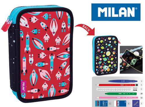 Piórnik MILAN 2-poziomowy z wyposażeniem z kolekcji SUPER HEROES SPACE NOWOŚĆ: Elementy fluorescencyjne świecące w ciemności. Wyposażenie: długopis CAPSULA UNO niebieski, ołówek sześciokątny HB, linijka trójkątna 15 cm, 18 flamastrów, 12 kredek trójkątnych, temperówka, 2 gumki do ścierania. Przy produkcji piórników użyto najlepszych materiałów, bardzo wytrzymałych suwaków oraz wzmocnionych nici. Niepowtarzalne wzornictwo. W piórnikach MILAN znajdziesz min.: • Kredki MILAN przy produkcji których użyto drewna pochodzącego wyłącznie z plantacji, gwarantujących nie używanie drewna z lasów deszczowych Rysik kredki na całej długości jest przyklejony do drewna co zapobiega jego łamaniu. Dzięki trójkątnej budowie kredka jest ergonomiczna i wygodnie trzyma się dziecku. • Flamastry MILAN posiadają wytrzymałą i elastyczną stożkową końcówką, która nie wpada do środka nawet przy silnym nacisku. Po chwilowym odkształceniu końcówka zawsze wraca do pierwotnego kształtu. Tusz na bazie wody. Flamastry nie zawierają ftalanów, metali ciężkich i innych • Temperówkę z bezpiecznym przykręconym ostrzem dzięki czemu ostrze nie oddzieli się od obudowy temperówki • Gumkę z naturalnym kauczukiem. Wymiary: 19,5 x 13 x 5 cm. Materiał wierzchni: 100% poliester. Podszewka 150D poliester.