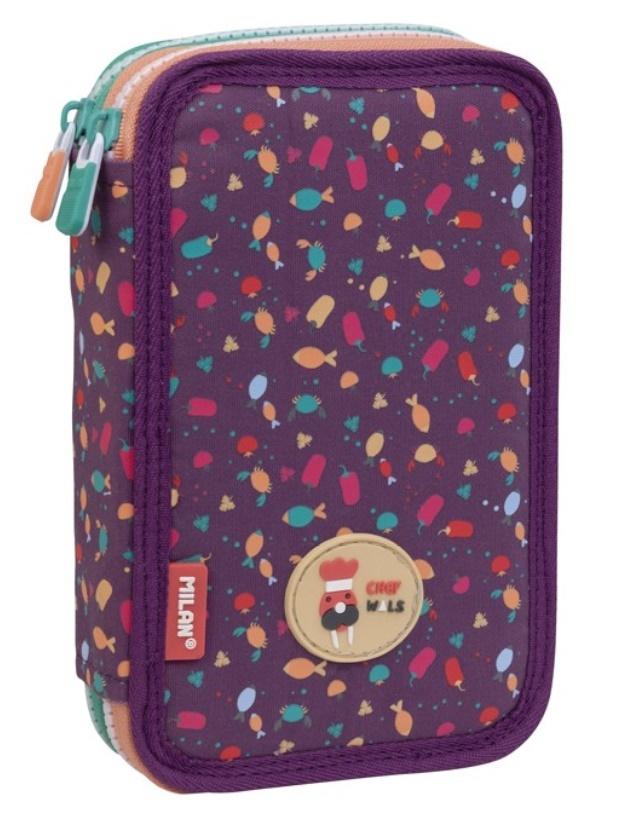 Piórnik piętrowy z wypełnieniem. Seria specjalna Super Chefs, kolor fioletowy. Zawartość: 2 gumki do ścierania (4024 i niebieski Nata), 1 temperówka AFILA, 1 ołówek grafitowy HB, 1 niebieski długopis CAPSULE Uno, 1 linijka 15 cm, 12 trójkątnych kolorowych ołówków, 18 stożkowych długopisów. Skład: bawełniana strona zewnętrzna i poliestrowa podszewka. Wymiary: Rozmiar: 19,5 x 13 x 5 cm.