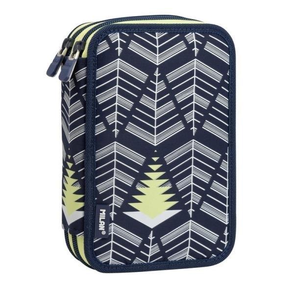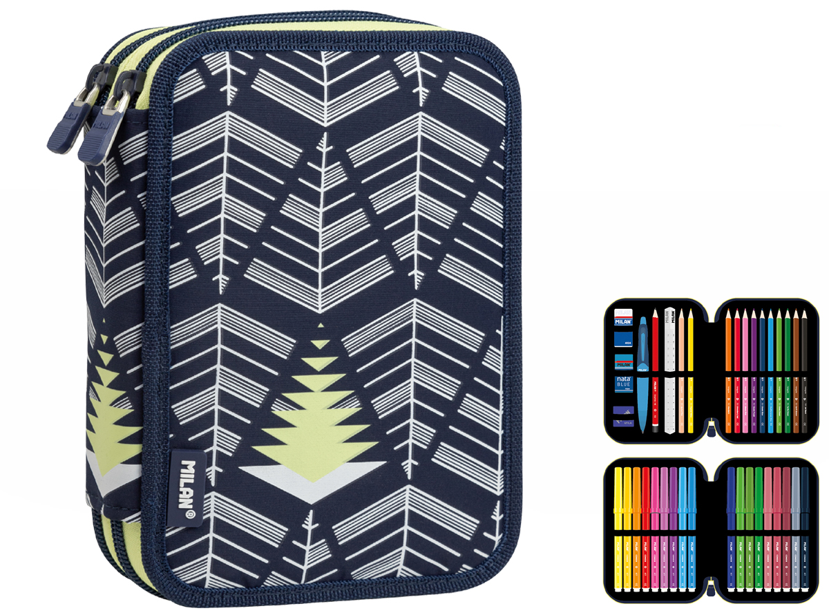 Piórnik 2 poziomowy z wyposażeniem marki MILAN. Piórnik wyróżnia się oryginalną grafiką. Każda przegroda zamykana jest na suwak.