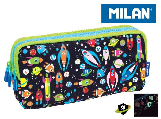 Piórnik saszetka MILAN z 3 komorami z kolekcji SUPER HEROES SPACE. NOWOŚĆ: Elementy fluorescencyjne świecące w ciemności. Każda komora zapinana osobno na suwak. Wymiary: 22 x 11 x 6,5 cm Materiał wierzchni: 100% poliester. Podszewka 150D poliester.