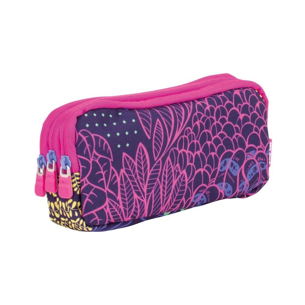 Piórnik saszetka MILAN z 3 szerokimi przegródkami ułatwiającymi organizację zawartości. Seria specjalna ""ŚWIETLIKI"" z nadrukiem prezentującym różne formy roślinności, przywołuje na myśl środowisko, w którym żyją świetliki. Kolory są tak jasne, jak światło świetlików: liliowy, fuksja, żółty i zielony, które wyróżniają się na ciemnoliliowym tle. Zamek błyskawiczny i detale w kolorze fuksji. Skład: zewnętrzny i wewnętrzny 100% poliester. Wymiary: 22 x 11 x 6,5 cm.
