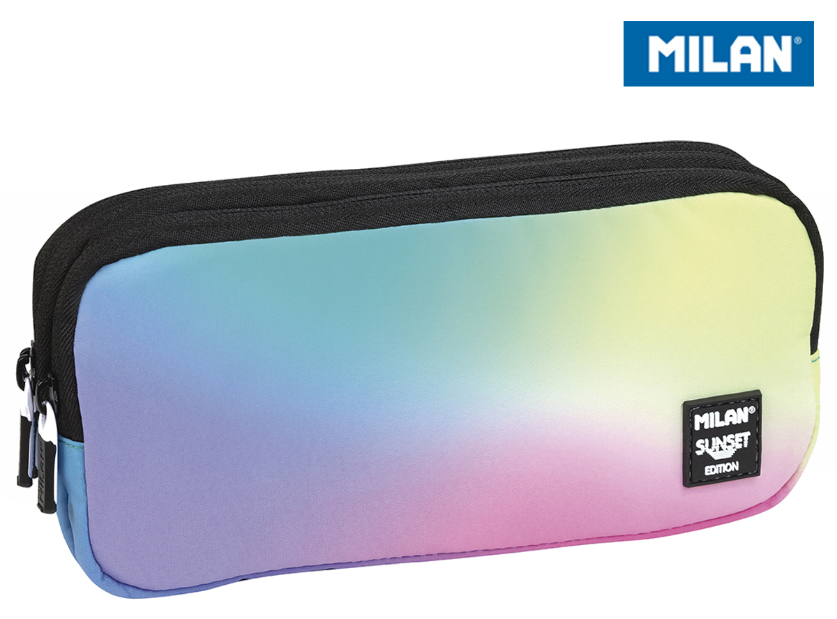 Piórnik saszetka MILAN z 3 komorami z kolekcji SUNSET w kolorach tęczy. Każda komora zapinana osobno na suwak. Materiał: poliestrowa podszewka zewnętrzna i wewnętrzna. Rozmiar: 22 x 11 x 6,5 cm.