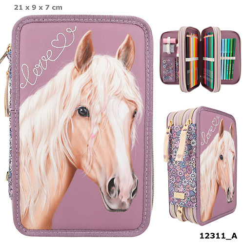 Piórnik potrójny z wyposażeniem Miss Melody. Brokatowe wykończenia na grzywach koników.