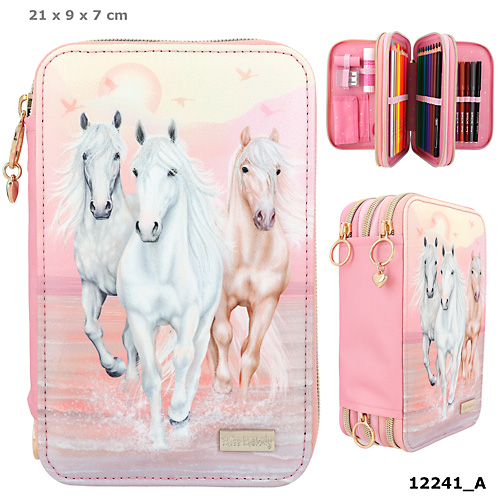 Piórnik potrójny z wyposażeniem Miss Melody. Brokatowe wykończenia na grzywach koników.