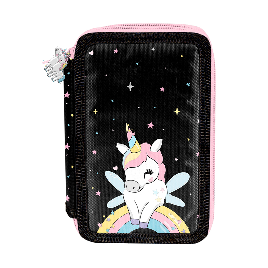 Piórnik z wyposażeniem Unicorn. Uniwersalny, trzykomorowy model z przyborami, zapinany na zamek błyskawiczny.