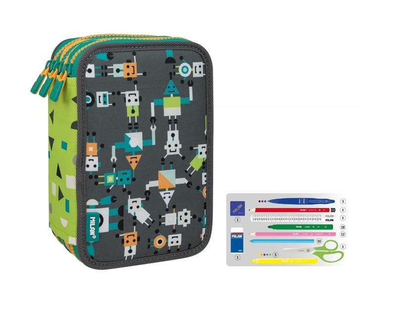 Piórnik MILAN 3-poziomowy z wyposażeniem z kolekcji HAPPY BOTS Wyposażenie: 12 kredek trójkątnych, 10 kredek PLASTIPASTEL, 18 flamastrów ze stożkową końcówką, 3 długopisy CAPSULA UNO, ołówek HB, 5 zakreślaczy FLUO junior, nożyczki, temperówka AFILA, 2 gumki syntetyczne, linijka trójkątna. Przy produkcji piórników użyto najlepszych materiałów, bardzo wytrzymałych suwaków oraz wzmocnionych nici. Niepowtarzalne wzornictwo W piórnikach MILAN znajdziesz min.: ? Kredki MILAN przy produkcji których użyto drewna pochodzącego wyłącznie z plantacji, gwarantujących nie używanie drewna z lasów deszczowych Rysik kredki na całej długości jest przyklejony do drewna co zapobiega jego łamaniu. Dzięki trójkątnej budowie kredka jest ergonomiczna i wygodnie trzyma się dziecku. ? Flamastry MILAN posiadają wytrzymałą i elastyczną stożkową końcówką, która nie wpada do środka nawet przy silnym nacisku. Po chwilowym odkształceniu końcówka zawsze wraca do pierwotnego kształtu. Tusz na bazie wody. Flamastry nie zawierają ftalanów, metali ciężkich i innych substancji toksycznych. Są bezpieczne dla dzieci. ? Temperówkę z bezpiecznym przykręconym ostrzem dzięki czemu ostrze nie dzieli się od obudowy temperówki. ? Trójkątną linijkę. ? Gumkę z naturalnym kauczukiem. Wymiary: 19,5 x 13 x 7,5 cm. Materiał wierzchni: 100% poliester. Podszewka 150D poliester.
