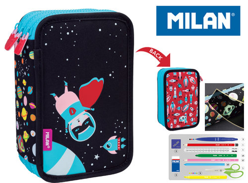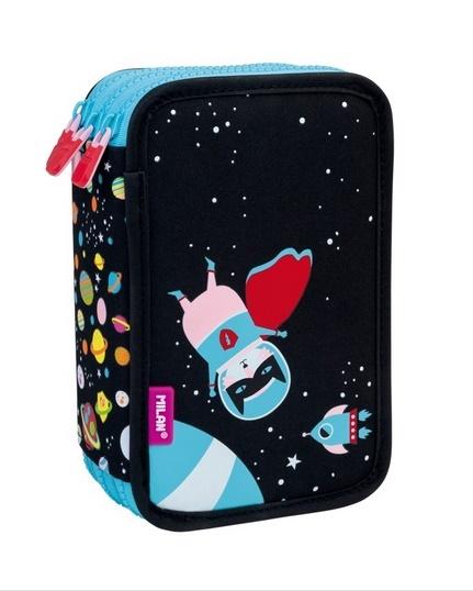Piórnik MILAN 3-poziomowy z wyposażeniem z kolekcji SUPER HEROES SPACE. NOWOŚĆ: Elementy fluorescencyjne świecące w ciemności. Wyposażenie: 12 kredek trójkątnych, 10 kredek PLASTIPASTEL, 18 flamastrów ze stożkową końcówką, 3 długopisy CAPSULA UNO, ołówek HB, 5 zakreślaczy FLUO junior, nożyczki, temperówka AFILA, 2 gumki syntetyczne, linijka trójkątna. Przy produkcji piórników użyto najlepszych materiałów, bardzo wytrzymałych suwaków oraz wzmocnionych nici. Niepowtarzalne wzornictwo W piórnikach MILAN znajdziesz min.: • Kredki MILAN przy produkcji których użyto drewna pochodzącego wyłącznie z plantacji, gwarantujących nie używanie drewna z lasów deszczowych Rysik kredki na całej długości jest przyklejony do drewna co zapobiega jego łamaniu. Dzięki trójkątnej budowie kredka jest ergonomiczna i wygodnie trzyma się dziecku. • Flamastry MILAN posiadają wytrzymałą i elastyczną stożkową końcówką, która nie wpada do środka nawet przy silnym nacisku. Po chwilowym odkształceniu końcówka zawsze wraca do pierwotnego kształtu. Tusz na bazie wody. Flamastry nie zawierają ftalanów, metali ciężkich i innych substancji toksycznych. Są bezpieczne dla dzieci. • Temperówkę z bezpiecznym przykręconym ostrzem dzięki czemu ostrze nie dzieli się od obudowy temperówki. • Trójkątną linijkę. • Gumkę z naturalnym kauczukiem. Wymiary: 19,5 x 13 x 7,5 cm. Materiał wierzchni: 100% poliester. Podszewka 150D poliester.