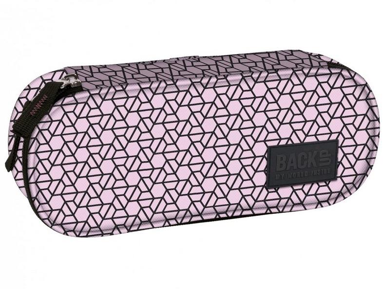 Piórnik BackUP model A 02 w ciekawe geometryczne wzory, pastelowy jasny róż stonowano czernią. Wyposażenie: - wewnętrzny organizer na 5 ołówków - wewnętrzna klapka z organizerem i zapinaną kieszenią - podszewka z nadrukiem logo - podwójny ściągacz zamka - rozmiar 23x9x5cm