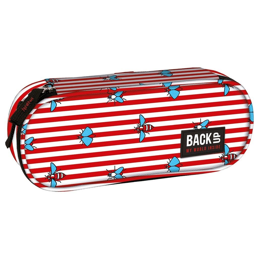 Piórnik BackUP model A 26 o wyjątkowym wzorze w urocze muchy i ćmy na tle czerwono-białych pasków. Wyposażenie: - wewnętrzny organizer na 5 ołówków - wewnętrzna klapka z organizerem i zapinaną kieszenią - podszewka z nadrukiem logo - podwójny ściągacz zamka
