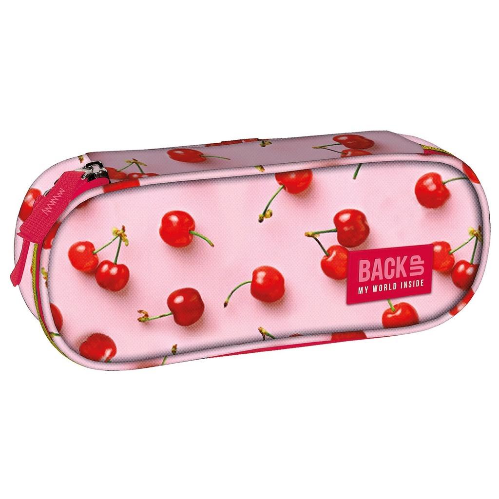 Piórnik BackUP model A 31 najpyszniejszy wzór w ulubionym kolorze różu o odcieniu malinowego kremu z motywem przesłodkich wisienek. Wyposażenie: - wewnętrzny organizer na 5 ołówków - wewnętrzna klapka z organizerem i zapinaną kieszenią - podszewka z nadrukiem logo - podwójny ściągacz zamka