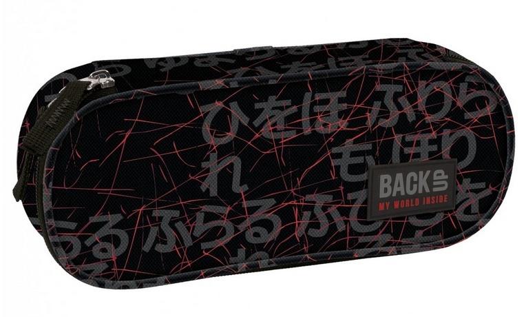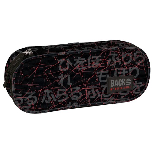 Piórnik BackUP model A 47 czarne tło, japońskie litery w szarym kolorze i czerwone rysy, wzór jednocześnie spokojny, ale z niewątpliwą nutką szaleństwa, którą podkręcają czerwone dodatki. Wyposażenie: - wewnętrzny organizer na 5 ołówków - wewnętrzna klapka z organizerem i zapinaną kieszenią - podszewka z nadrukiem logo - podwójny ściągacz zamka - rozmiar 23x9x5cm