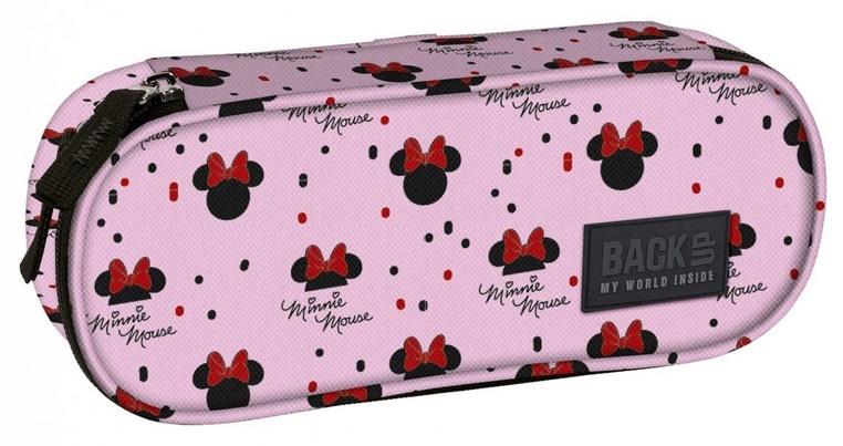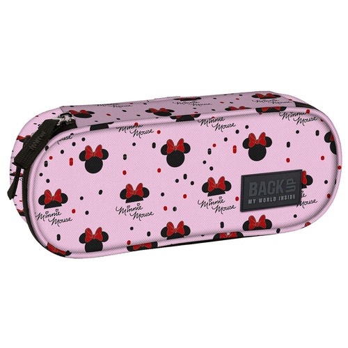 Piórnik BackUP model A MINNIE 90 ponadczasowy wzór w kolorze delikatnego różu z czarnymi postaciami Myszki Minnie z nieodłączną, czerwoną kokardką. Wyposażenie: - wewnętrzny organizer na 5 ołówków - wewnętrzna klapka z organizerem i zapinaną kieszenią - podszewka z nadrukiem logo - podwójny ściągacz zamka - rozmiar 23x9x5cm