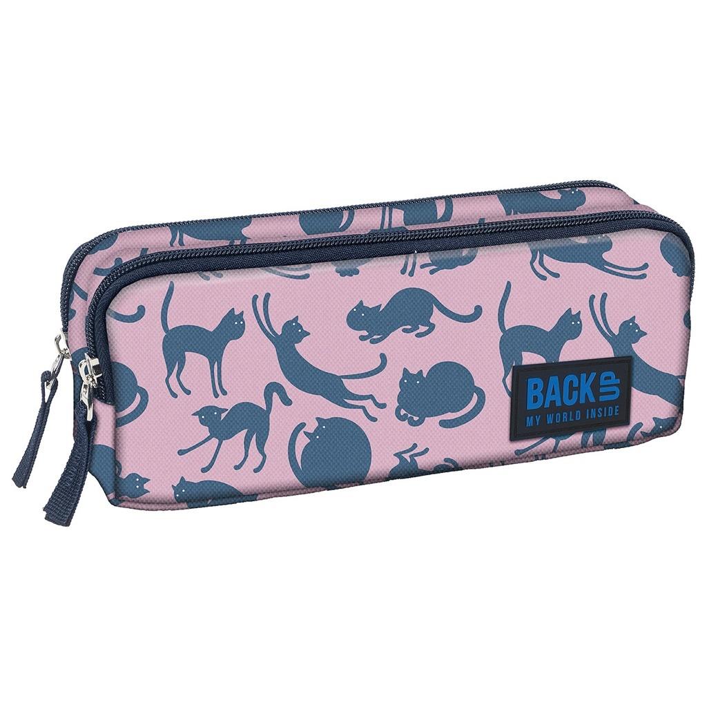 Piórnik BackUP model B 18 duże szaro - niebieskie koty w zabawnych pozach przestawiono na różowym jasnym tle w pastelowej tonacji. Wyposażenie: - 2 zapinane komory - ściągacze zamka z tkaniny - podszewka z nadrukiem logo