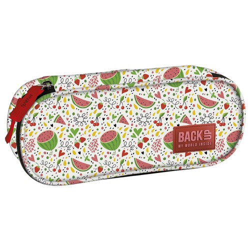 Piórnik BackUP model A 60 kremowe tło i czerwone arbuziki zostały ożywione malutkimi wisienkami i truskawkami i wykończone żółtym konfetti. Wyposażenie: - wewnętrzny organizer na 5 ołówków - wewnętrzna klapka z organizerem i zapinaną kieszenią - podszewka z nadrukiem logo - podwójny ściągacz zamka - rozmiar 23x9x5cm