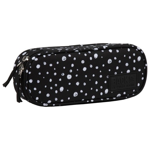 Czarny piórnik jednokomorowy w białe kropki różnej wielkości. Piórnik w formie jednokomorowego etui posiada: - wewnętrzny organizer na 9 ołówków - wewnętrzną klapkę z organizerem i zapinaną kieszenią - pojemną komorę na pozostałe akcesoria rozmiar 23x9x5cm, waga: 120g