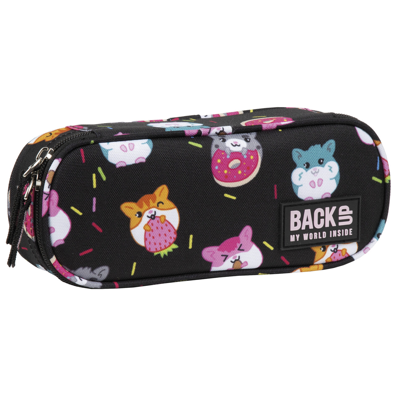 Czarny piórnik jednokomorowy w wesołe chomiki zajadające słodkości, w zaskakujących połączeniach kolorystycznych. Piórnik w formie jednokomorowego etui posiada: - wewnętrzny organizer na 9 ołówków - wewnętrzną klapkę z organizerem i zapinaną kieszenią - pojemną komorę na pozostałe akcesoria - rozmiar 23x9x5cm, waga: 120g