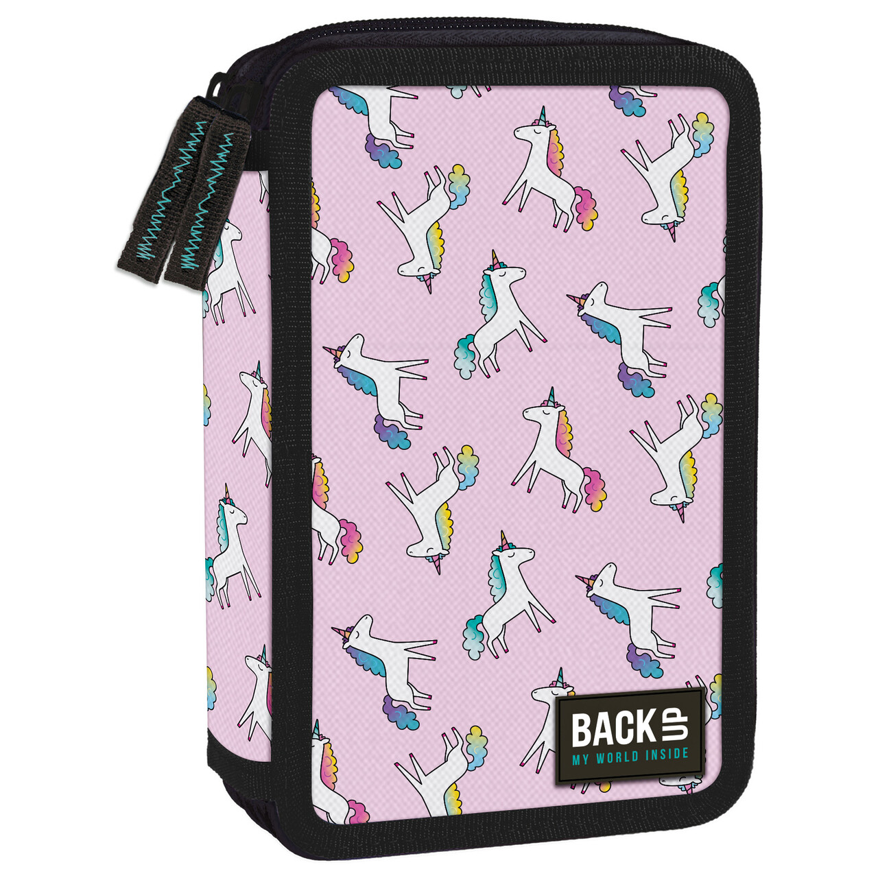 Piórnik z wyposażeniem unicorn pastele. Pudrowo różowe tło ozdabiają kolorowe jednorożce, które kochają wszyscy. Mocnym akcentem są czarne dodatki. Piórnik z wyposażeniem, dwukomorowy, w środku znajdziemy: - 18 pisaków - 9 kredek ołówkowych - 2 długopisy - 2 ołówki - temperówkę, gumkę do mazania i linijkę rozmiar: 20x13x5cm, waga: 350g