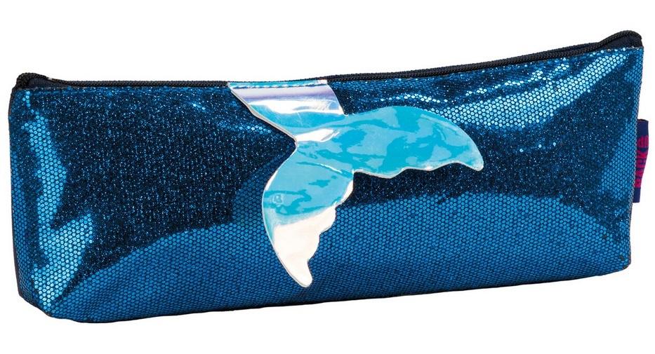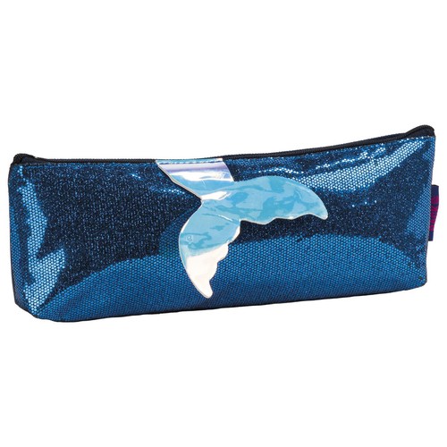 Jednokomorowy piórnik z granatowego brokatowego materiału z holograficznym ogonem syreny. - front piórnika pokryty brokatem - może posłużyć jako kosmetyczka - rozmiar 24x8x4cm waga: 22g