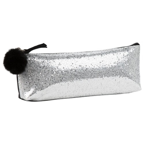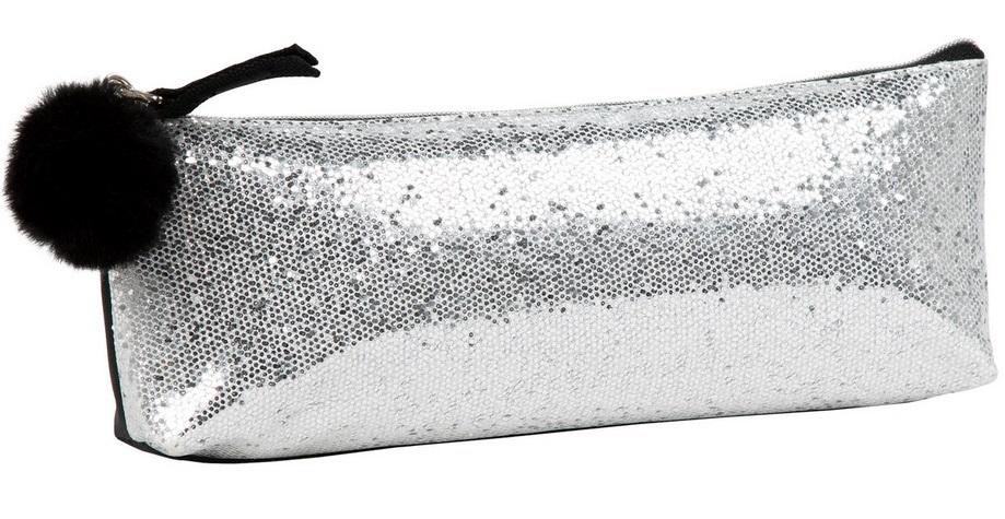 Jednokomorowy piórnik z brokatowego, srebrnego materiału z futerkowym pomponem przy zamku. - front piórnika pokryty brokatem - może posłużyć jako kosmetyczka - rozmiar 24x8x4cm waga: 22g