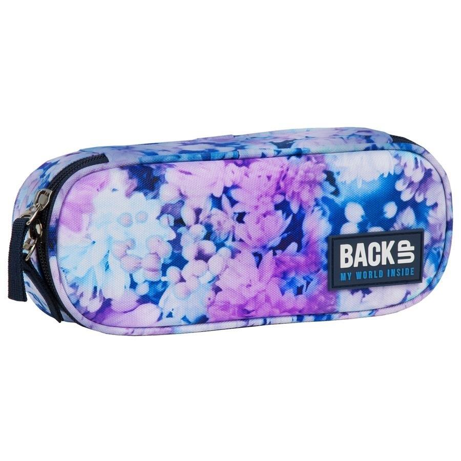 Piórnik w fioletowe i lazurowe kwiatostany bzu, które przywodzą na myśl majowe radosne dni. Granatowe zamki i naszywka.