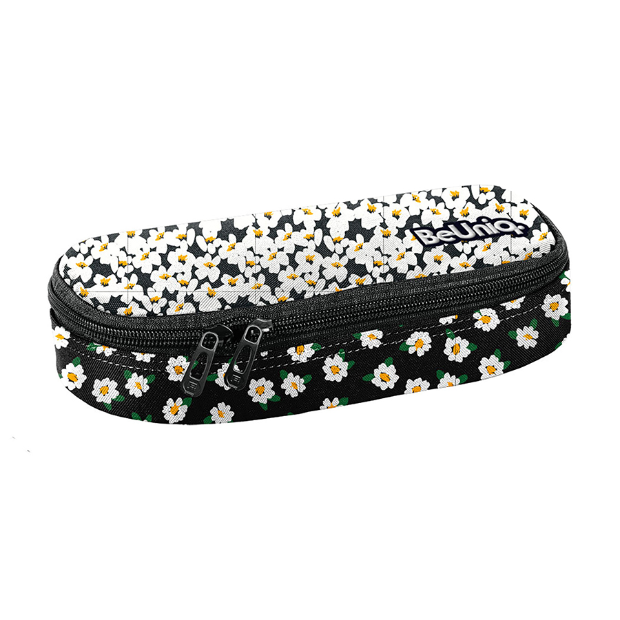 Wewnątrz klapka z gumkami do ołowków i długopisów z jednej strony oraz z kieszonką na zamek z siatki z drugiej.