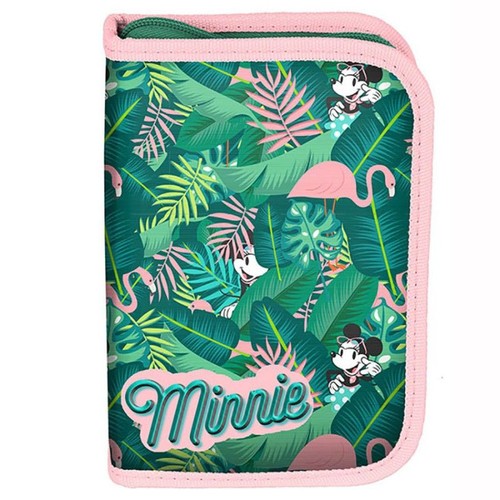 Piórnik jednokomorowy Minnie zielono-różowy z dwoma klapkami bez wyposażenia. Zadrukowane kolorowe wnętrze.