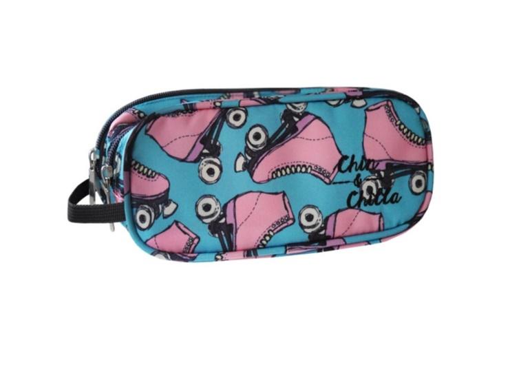 Piórnik błekitny z motywem wrotek, zasuwany na zamek.