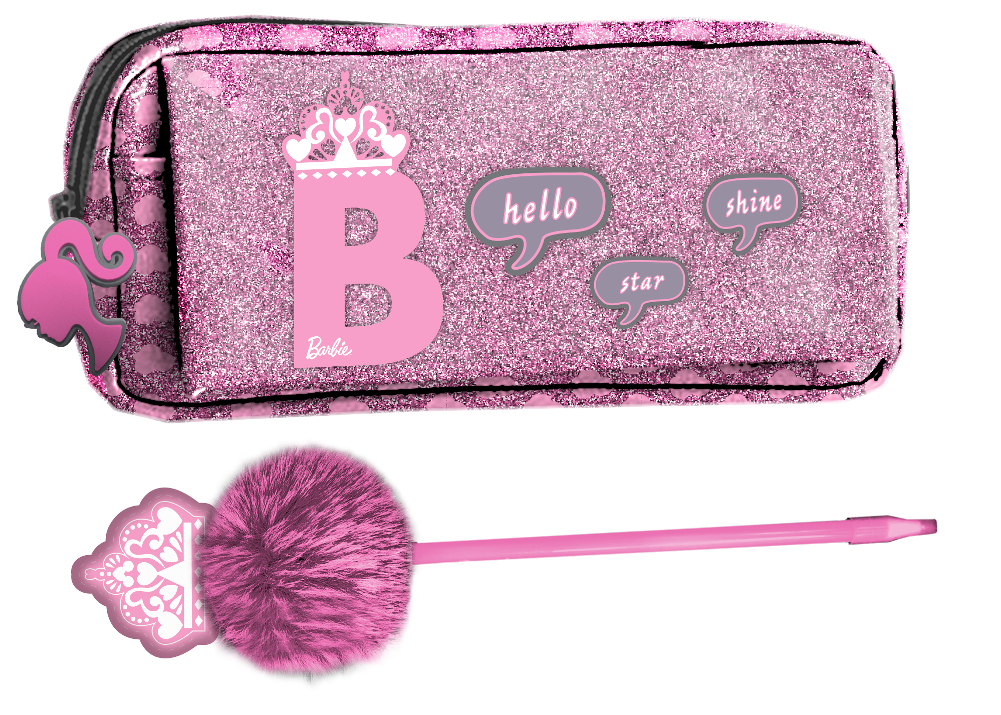 Piórnik brokatowy z długopisem z pomponem i ozdobną końcówką. Piórnik zapakowany jest w kolorowym pudełku prezentowym.