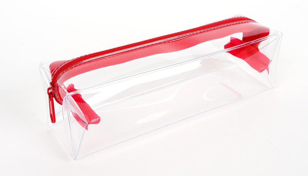 Przezroczyste etui z zamkiem błyskawicznym, powierzchnia zmywalna, wymiary piórnika 20,5 x 5,5 x 6 cm (w x h x d), bez wyposażenia.