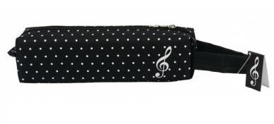 Prostokątny piórnik w kolorze czarnym, z kluczem wiolinowym i nadrukiem kropek po obu stronach, o wymiarze 20 x 5,5 x 5,5 cm.
