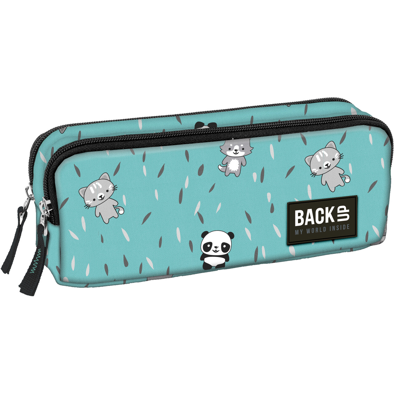 Miętowy piórnik w szopy, liski, kotki i pandy. Kontrastowe czarne zamki i naszywka. - 2 zapinane na zamek komory - wygodny uchwyt zamka - rozmiar 23x11x6cm, waga:55g