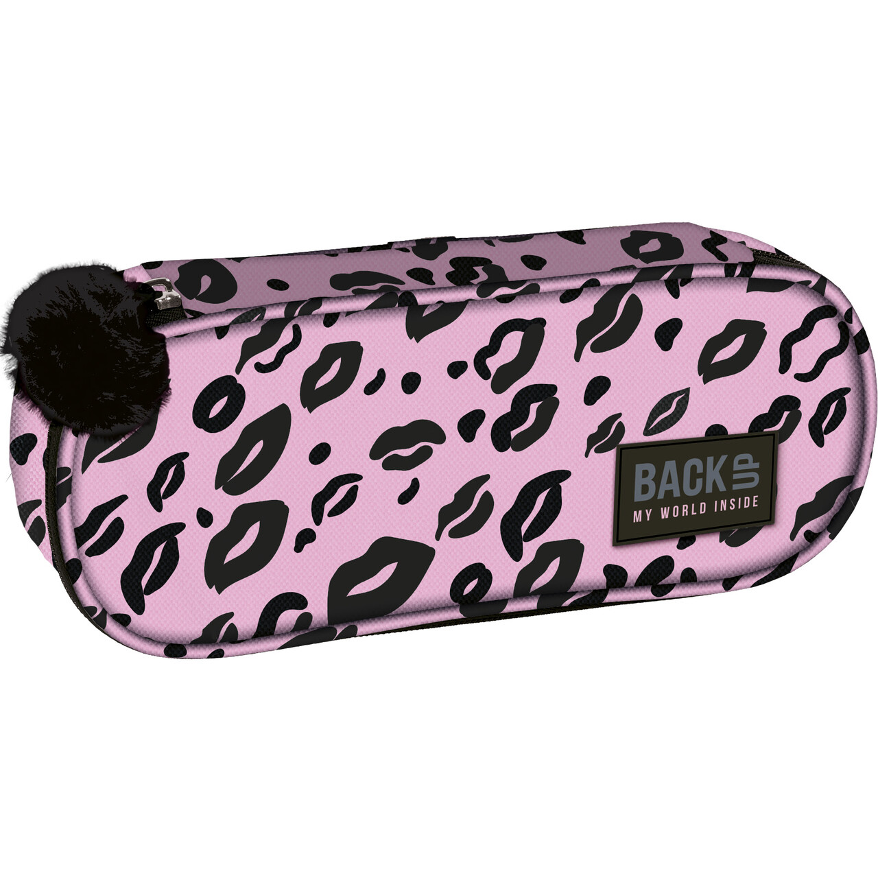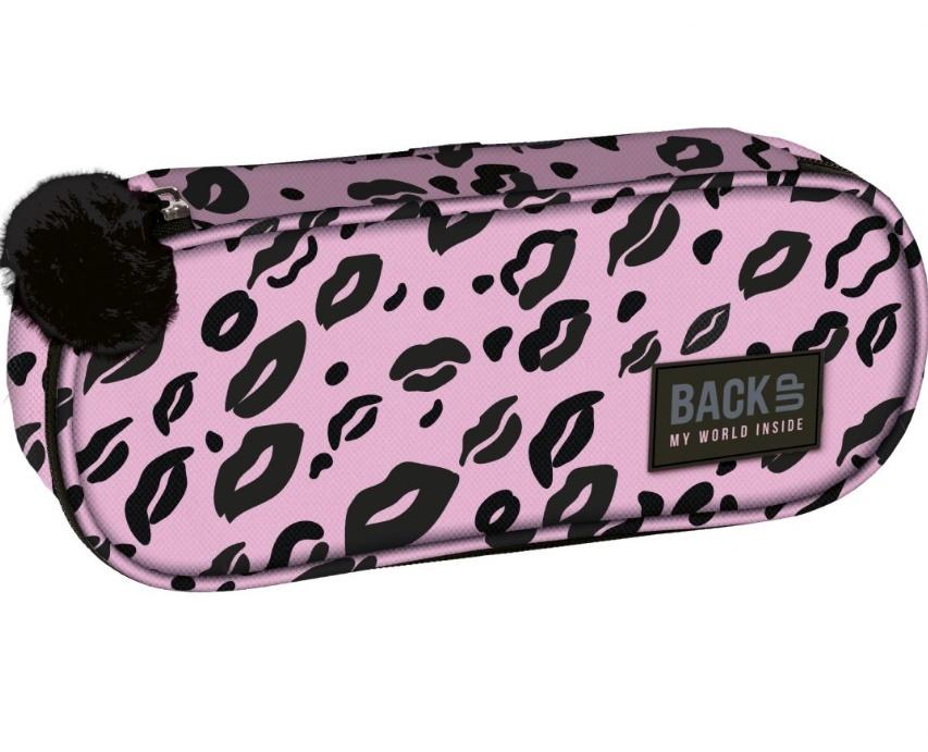 Piórnik jednokomorowy w jasno różowym kolorze, z pomponem z futerka. Usteczka tworzą panterkowy wzór.