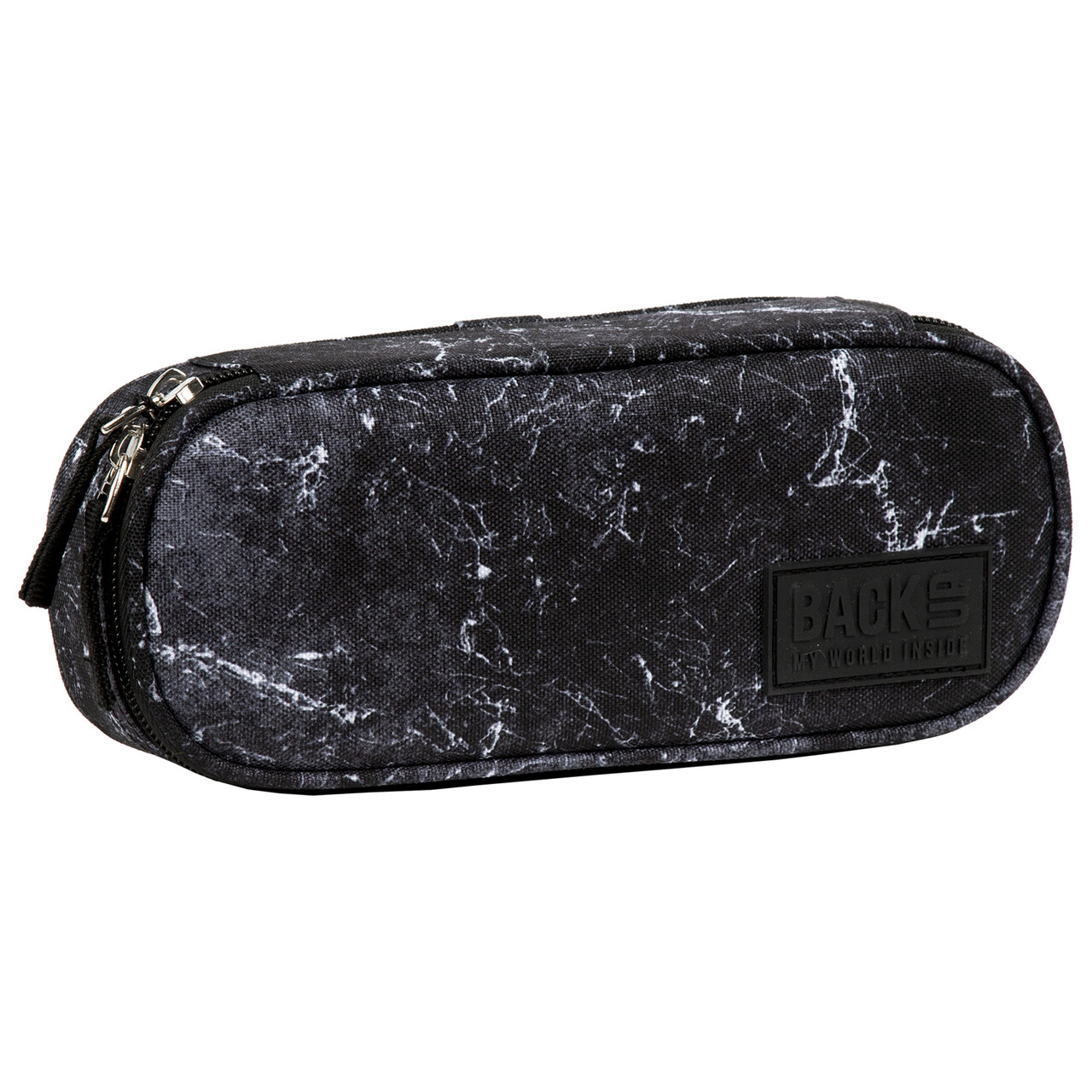Ciemny piórnik jednokomorowy w marmurkowy, monochromatyczny wzór.