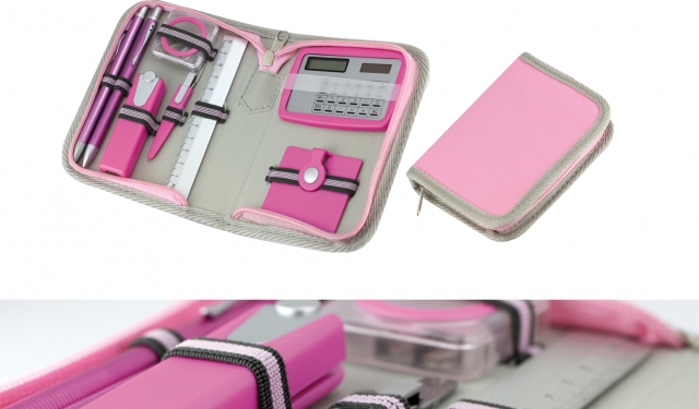 Piórnik z wyposażeniem (kalkulator, linijka, długopis, ołówek, spinacze)