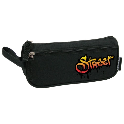 Piórnik saszetka jednokomorowy z kieszenią, czarny z kolorowym napisem. Zamki błyskawiczne z tasiemkami. Nie zawiera wyposażenia.