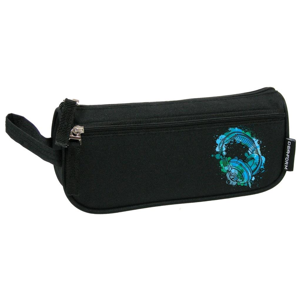 Piórnik saszetka jednokomorowy z kieszenią, czarny z kolorowym obrazkiem. Zamki błyskawiczne z tasiemkami. Nie zawiera wyposażenia.