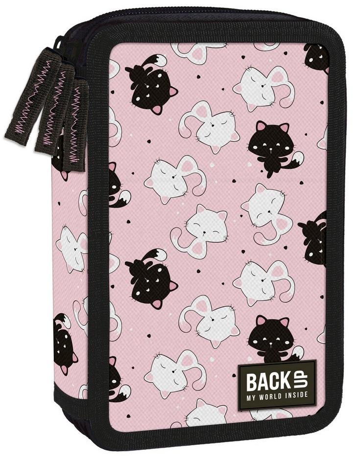 Pudrowo różowy piórnik dwukomorowy z wyposażeniem w czarne i białe kotki.